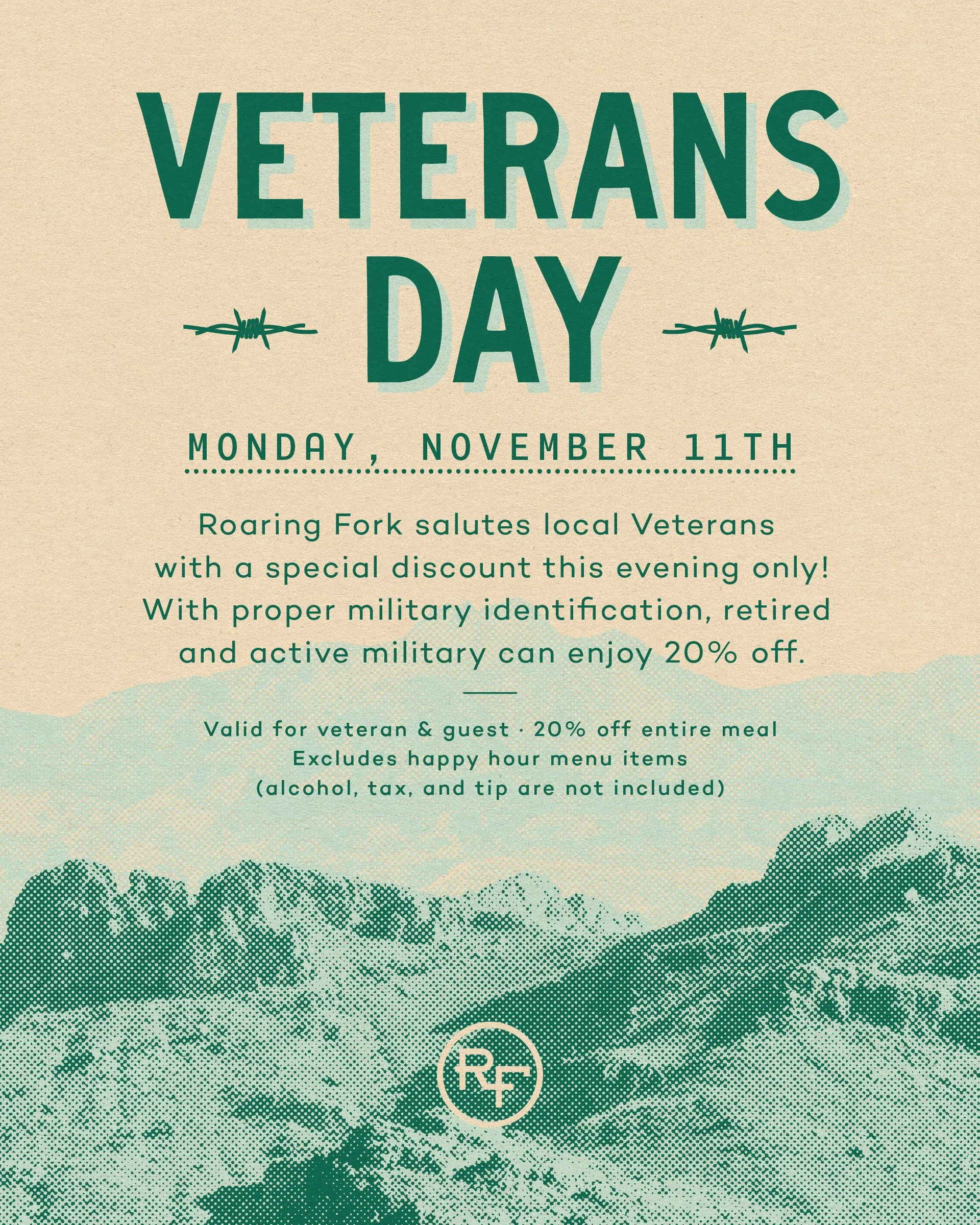 This Veteran’s Day, we’re honored to serve those who’ve served us. Veterans and active-duty military are invited to enjoy 20% off their entire meal (for themselves and a guest) as a gesture of our gratitude.